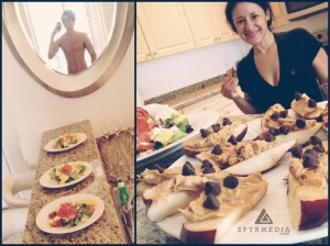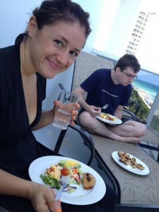 We went to the beach early and came back to the penthouse for lunch. I used my Walgreens ingredients and in 10 minutes our meal was ready! I scrambled 8 eggs and added some pepperoni slices. (Typically I wouldn’t buy packaged meat like that, but that was the best of the worst that was available.) I picked up 2 plastic containers of pre-made salad, so I used those as the base for the meal and topped the salad with the pepperoni scramble. Then I garnished the dish with a slice of mango and served it with a side of red delicious apples topped with almond butter and a sprinkle of chocolate-chips. This meal made for a nice protein source with the eggs and a fresh fruit dessert. And the non-Paleo crowd (Mike & Chip) enjoyed it, plus this lunch from Walgreens only cost $5.88/person.